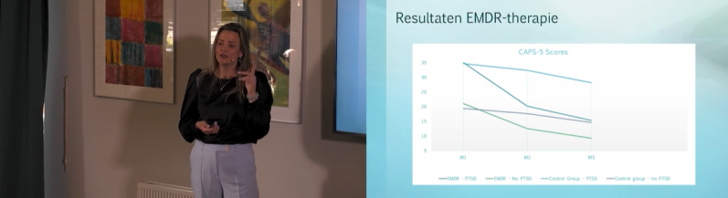 Daarna presenteerde drs. Laurian Hafkemeijer de resultaten van onderzoek naar het effect van EMDR op PTSS-klachten bij mensen met een persoonlijkheidsstoornis. Opvallend was dat ook cliënten zonder PTSS-diagnose profijt ondervonden van de behandeling, wat pleit voor bredere inzet van traumagerichte interventies in deze doelgroep.