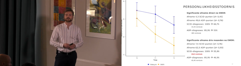 drs. Simon Hofman lichtte vervolgens de bevindingen uit het TEMPO-onderzoek toe. Hieruit bleek dat EMDR-therapie leidde tot een significante vermindering van de ernst van persoonlijkheidsstoornissen: zowel de totaalscores als het aantal diagnoses namen duidelijk af vergeleken met een controlegroep.